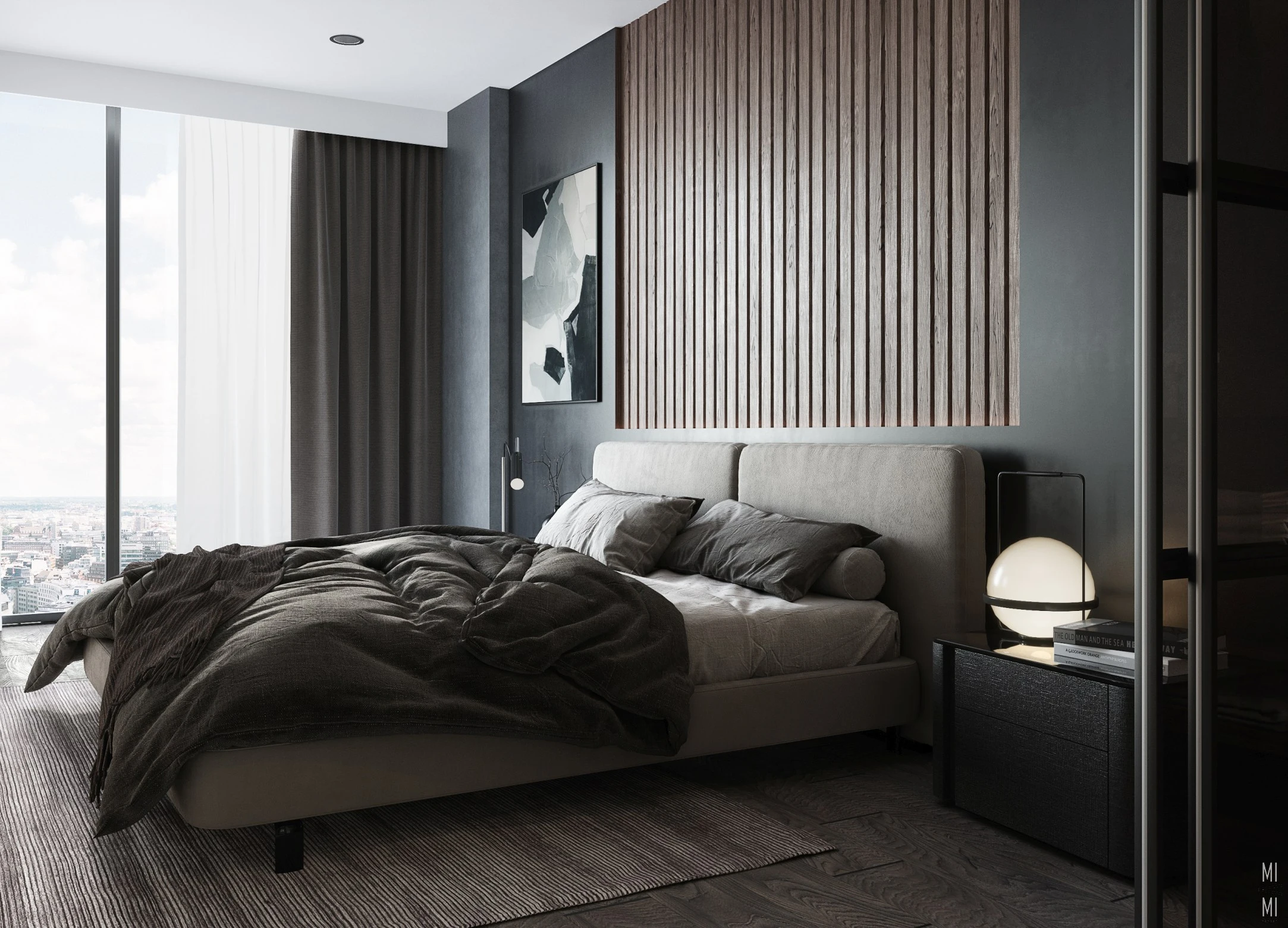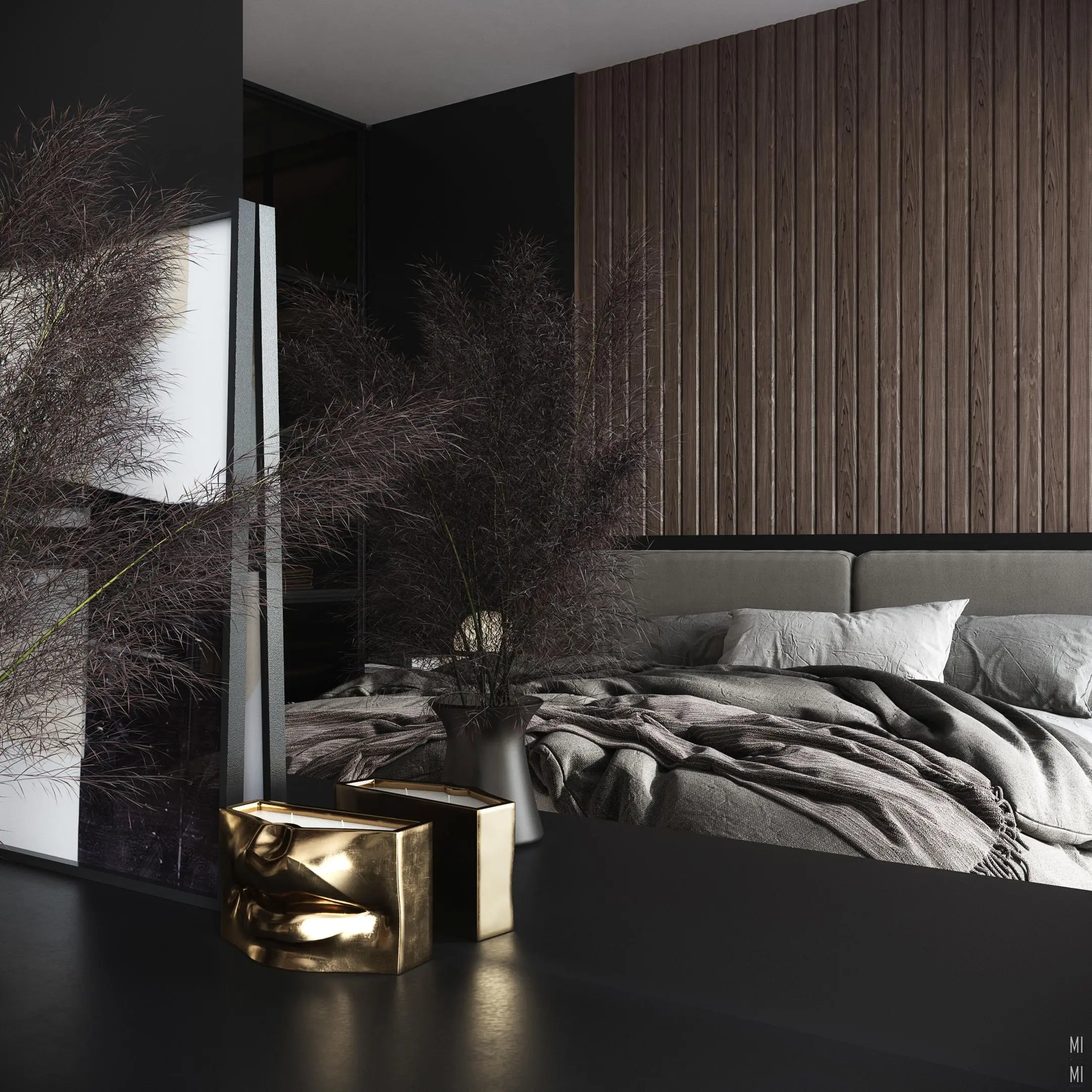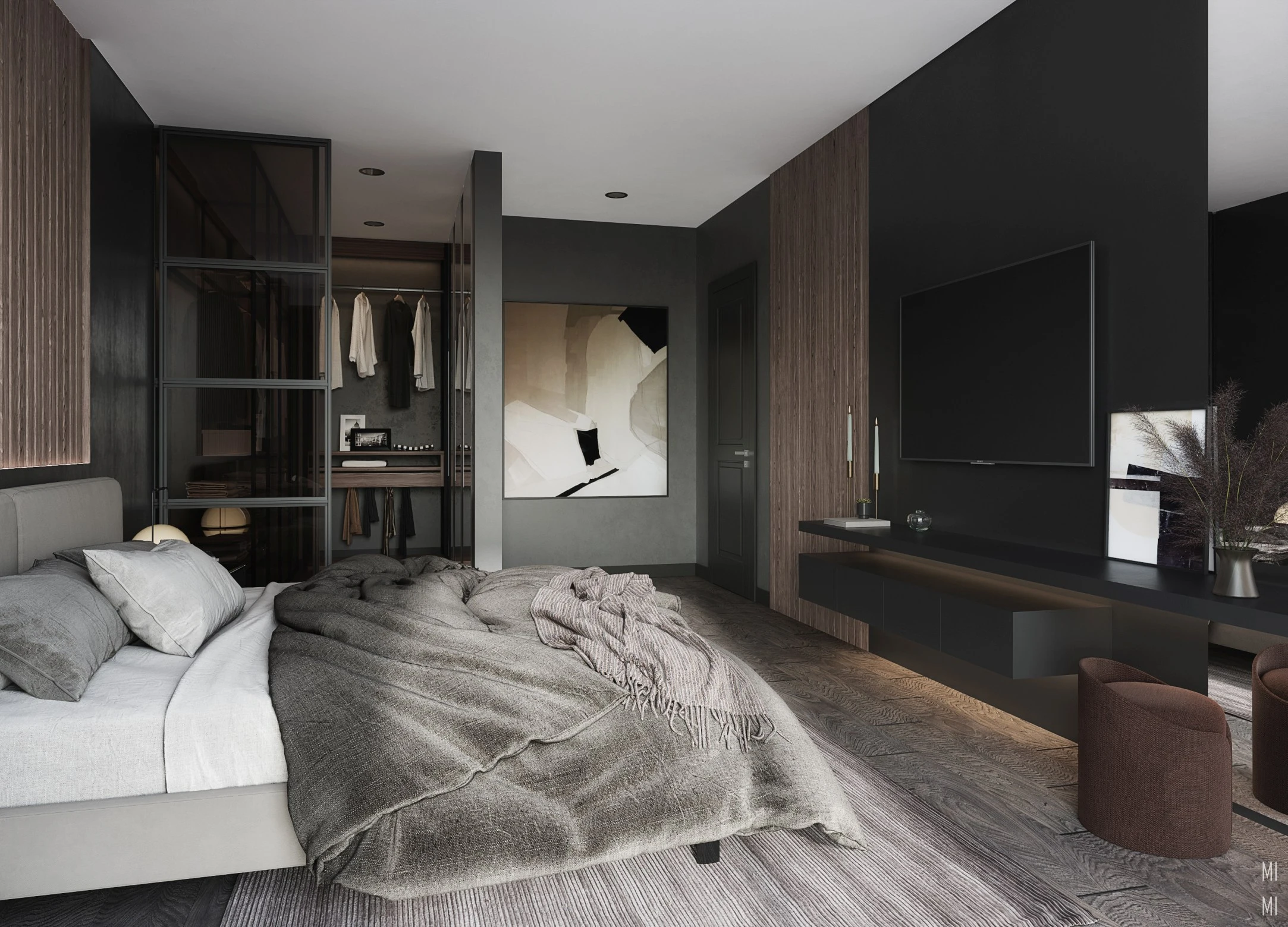 Zgodnie z oczekiwaniami klientów zaprojektowaliśmy wnętrze w minimalistycznym stylu, dbając o starannie przemyślane rozmieszczenie każdego elementu. Dominująca ciemna kolorystyka dodała wnętrzu przytulności i elegancji. Taki wystrój można uzupełnić o naturalne drewno, beżowe tekstylia, stylowe dodatki, dzieła sztuki oraz punktowe oświetlenie. Zastosowaliśmy także lustro, które optycznie powiększyło przestrzeń i nadało wnętrzu jeszcze większej głębi.